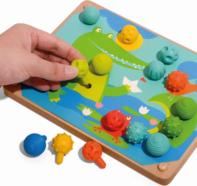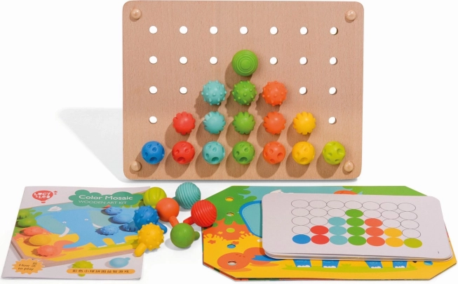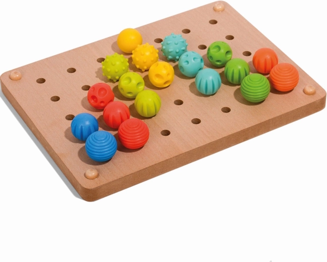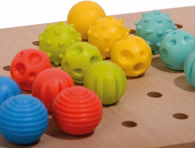 El set incluye 35 clavijas con distintas texturas de superficie, ideales para el desarrollo sensorial de los niños.