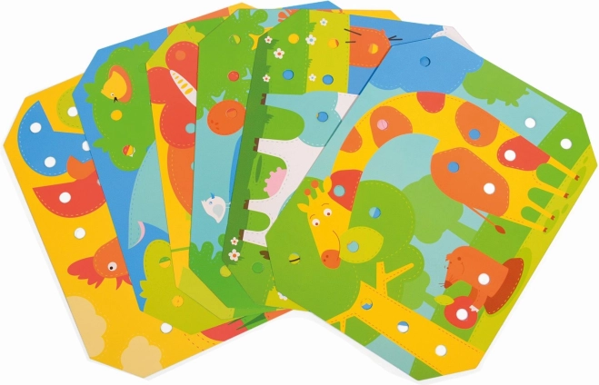 El conjunto contiene 12 imágenes a color con animales y 6 plantillas de doble cara que ofrecen numerosas posibilidades creativas.