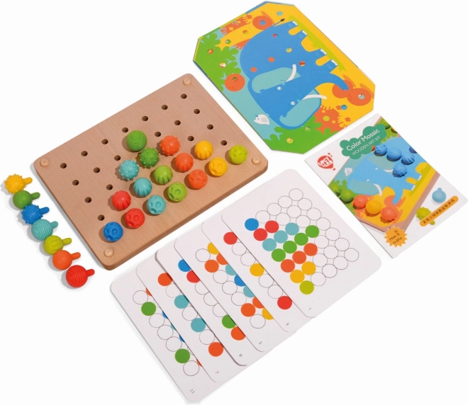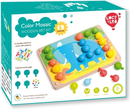 El mosaico y bordado es una excelente herramienta para que los más pequeños desarrollen habilidades de motricidad fina y su creatividad. Incluye 35 clavijas grandes de silicona en siete colores vibrantes, que los niños pueden usar para completar las plantillas de colores. El set también incluye 12 imágenes a color con animales y 6 plantillas de doble cara.
