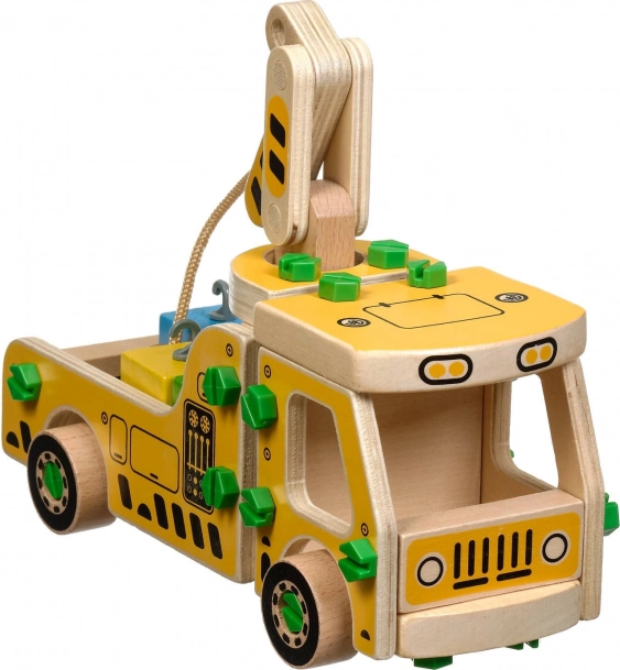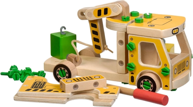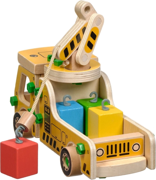 El paquete incluye 16 piezas de madera para montar la grúa, tornillos, un destornillador y 4 bloques de colores que representan la carga. Este juguete también funciona como material Montessori, ayudando al niño a desarrollar eficazmente diversas habilidades.