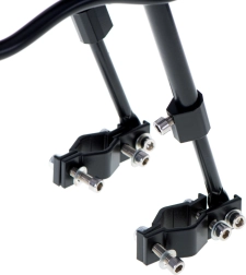 El montaje y desmontaje se realizan en un momento gracias a la abrazadera firme/cierre rápido y al material de montaje incluido. Las protecciones laterales resguardan las alforjas de los radios y en la parte trasera no falta el catadióptrico rojo para una mejor visibilidad al atardecer. En el paquete encontrarás el cuerpo con plataforma, brazos laterales, tirantes telescópicos, tornillos, gomas protectoras y el catadióptrico.