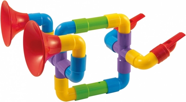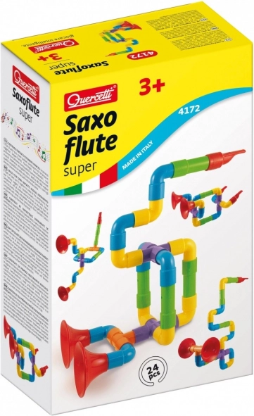 Con el set de construcción Quercetti Saxoflute Super, los niños pueden crear sus propios instrumentos musicales, como saxofones, flautas y trompetas, a partir de coloridos tubos y conectores de plástico. El set incluye 24 piezas que permiten diversas combinaciones y formas. Así, el juguete no solo estimula el pensamiento creativo, sino también la motricidad fina y la imaginación.