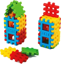 La gran cantidad de elementos en colores básicos permite construir torres, puentes y estructuras originales, desarrollando el pensamiento espacial.