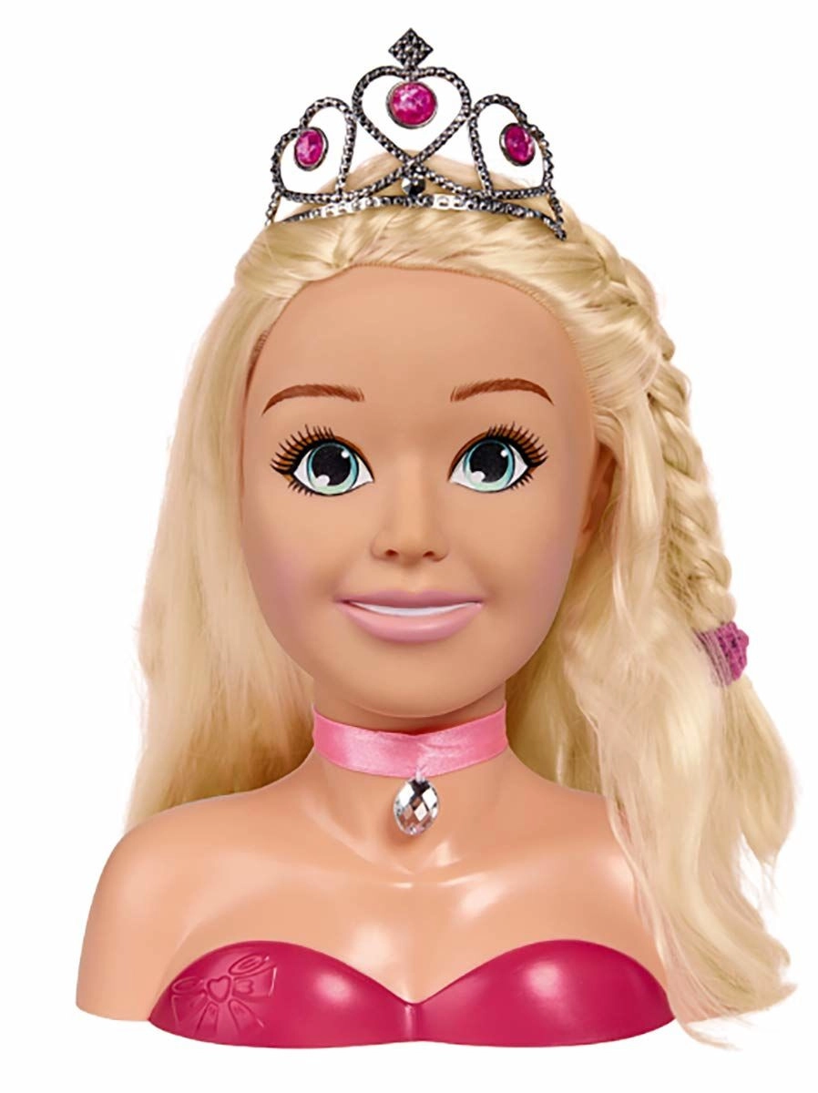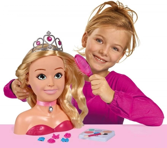 Esta encantadora cabeza de estilismo con largo cabello rubio y cinta rosa con piedra es ideal para pequeñas peluqueras y maquilladoras. Gracias al set de accesorios —desde la corona plateada hasta el cepillo, las horquillas y las gomas, pasando por la paleta de maquillaje— los niños crearán fácilmente peinados de cuento y maquillajes suaves.