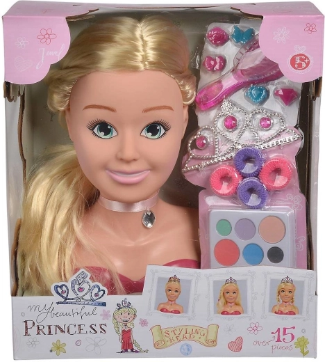- Cabeza de estilismo PRINCESS, corona, cepillo, 5 horquillas, gomas, paleta de maquillaje con aplicador