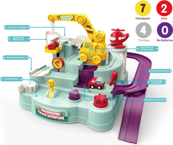 Esta pista de obstáculos convierte cada recorrido en una pequeña aventura. En la ruta esperan varios obstáculos que los niños superarán gracias al ingenioso control mediante ruedas y palancas. Cada éxito motiva a seguir intentando y aporta mucha alegría y sana competitividad.