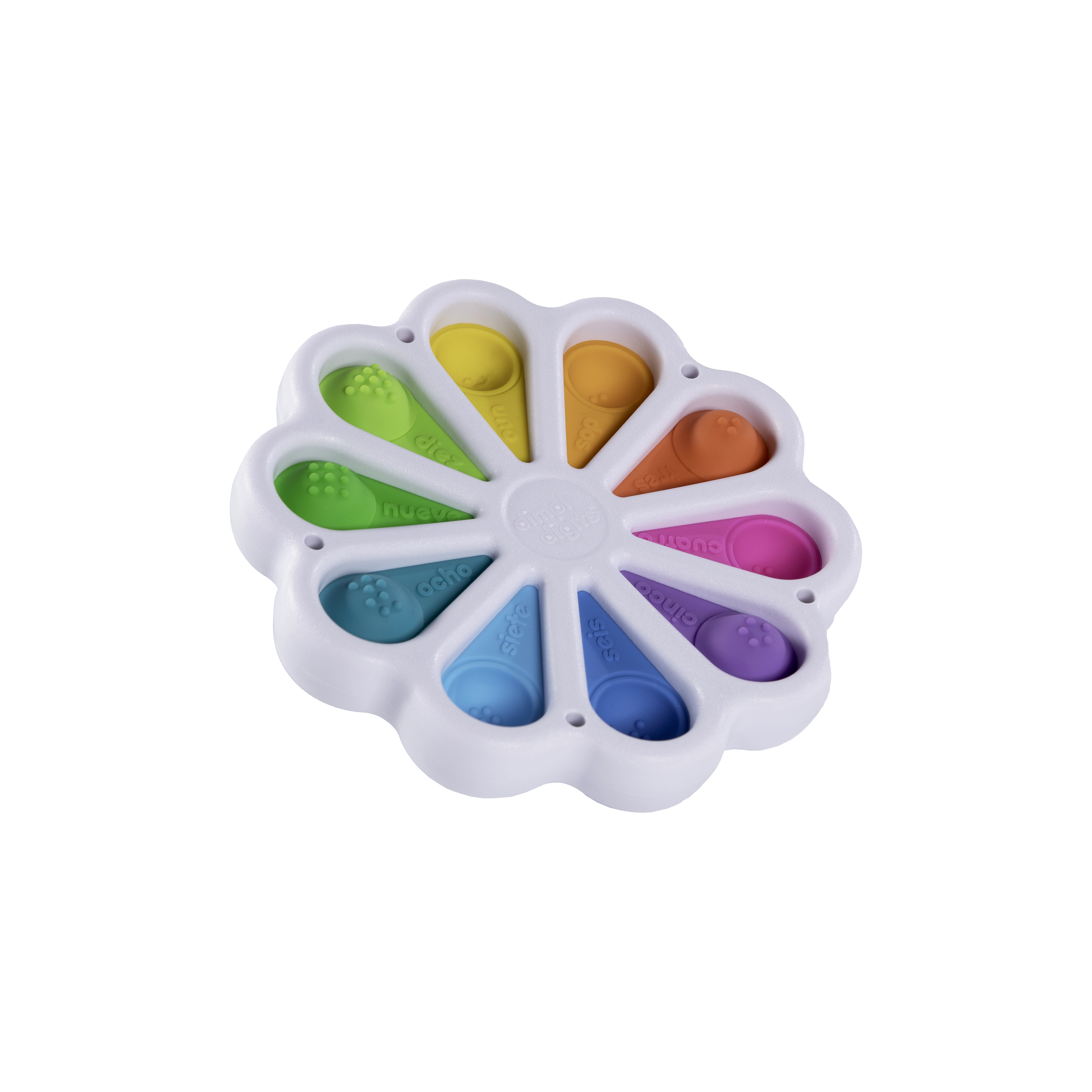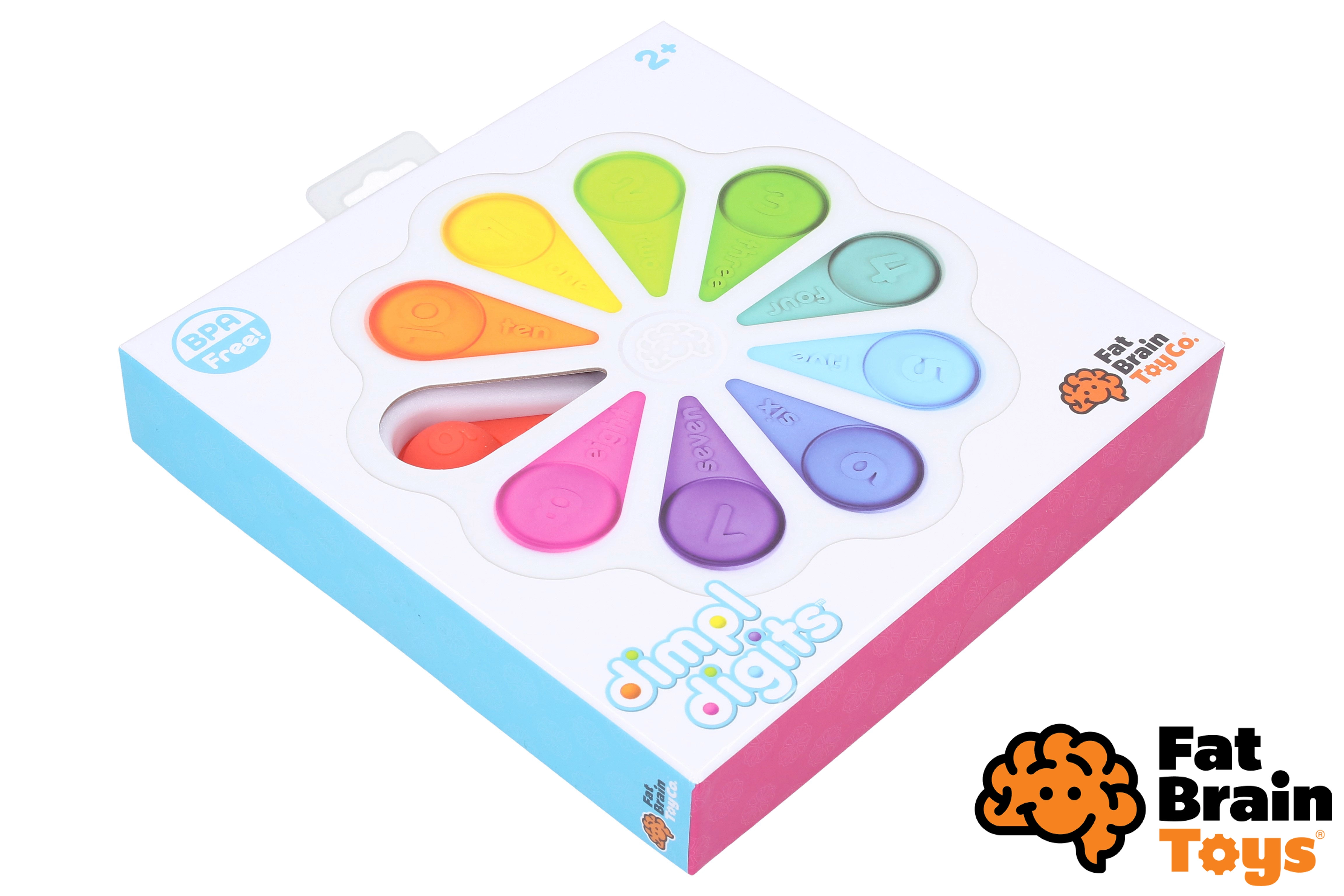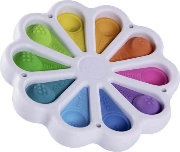 El juguete sensorial Dimpl Digits ofrece a los niños un calmante efecto “pop” y, al mismo tiempo, sus primeros pasos en el reconocimiento de los números. En la parte superior de cada burbuja hay un número con su palabra en inglés; en la parte inferior, el número correspondiente de puntos, de modo que los niños conectan de forma natural la vista, el tacto y las habilidades matemáticas básicas.