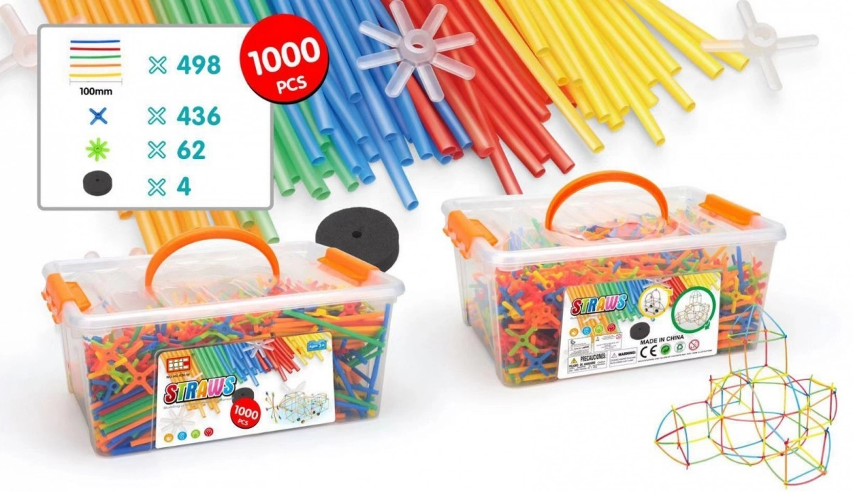 El juego de construcción de Pequeños Genios con pajitas pequeñas permite a los niños crear distintas formas utilizando varillas de conexión de colores y conectores en cruz.