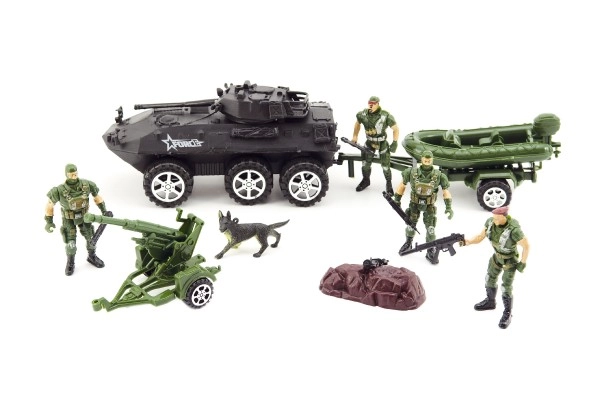 - Figuras de soldados, vehículo blindado, cañón, lancha, perro, accesorios