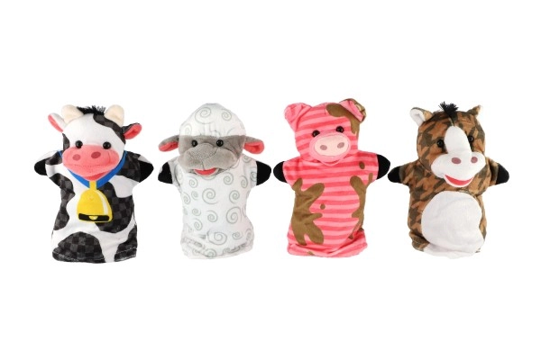 El set incluye cuatro marionetas de granja: vaca, oveja, cerdito y caballito, ideales para crear cuentos de hadas.