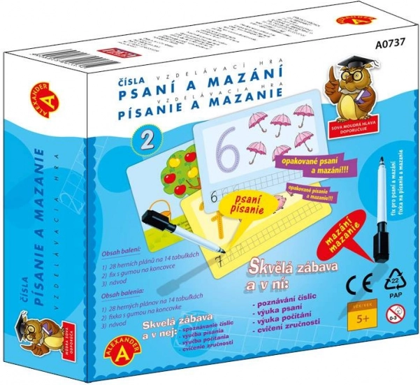 - 14 láminas a doble cara (28 motivos), rotulador borrable con esponja, instrucciones en checo y eslovaco