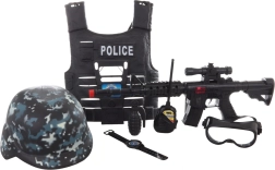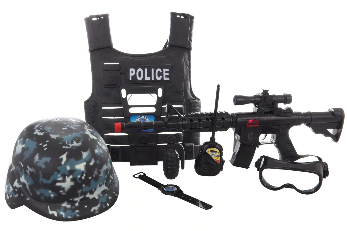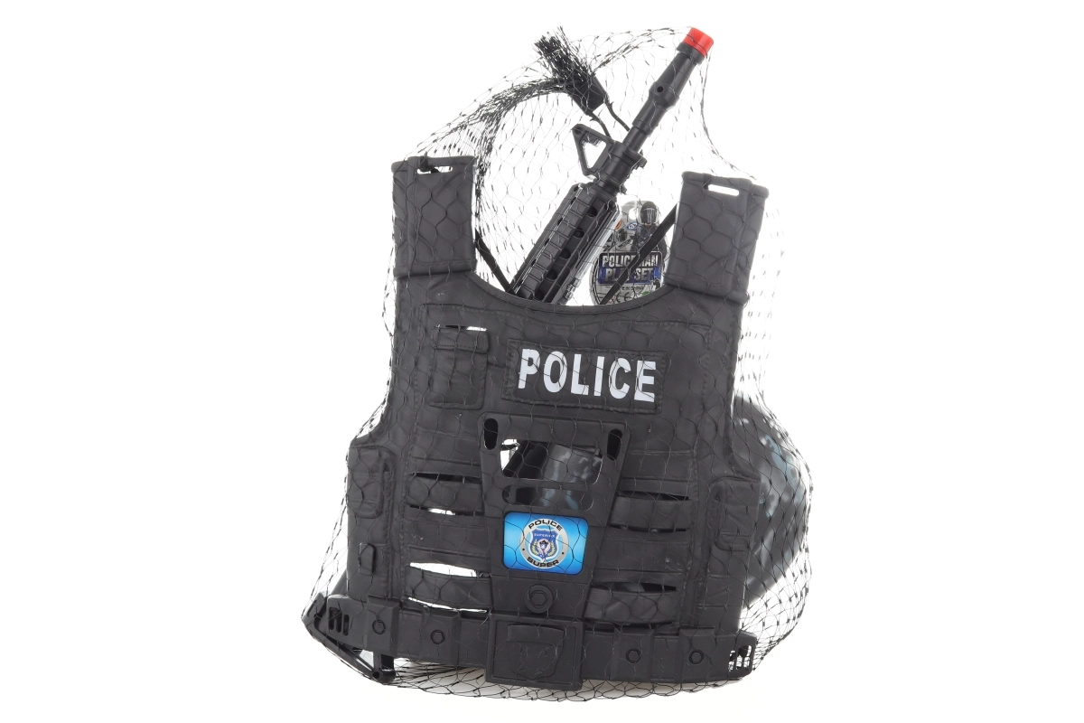 El casco, las gafas, el walkie‑talkie, la granada y el reloj conforman un set policial completo. Gracias al embalaje en red, tendrás todo bien organizado en un solo lugar.