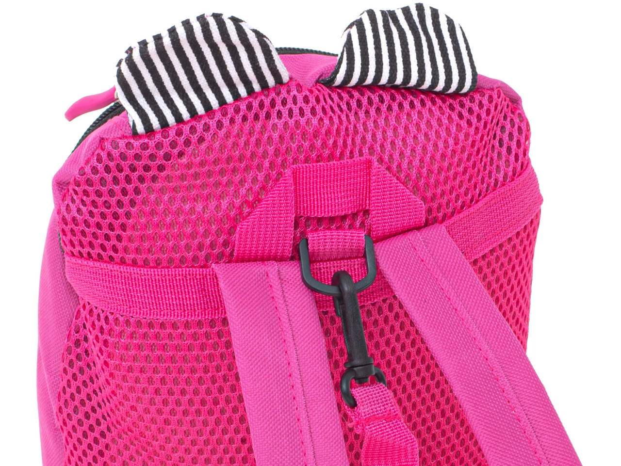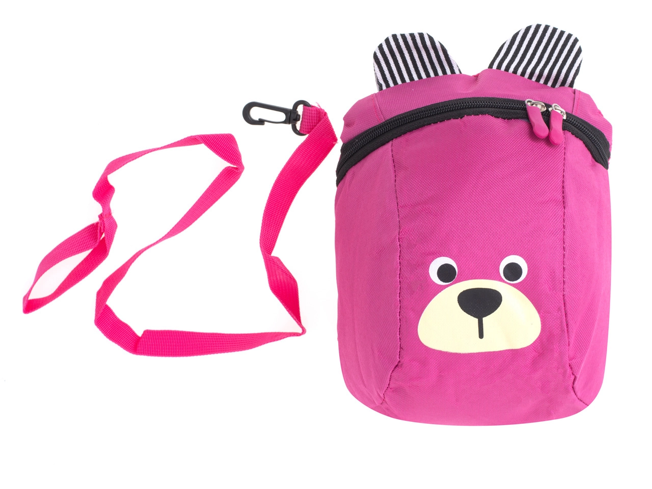 Adorable mochila infantil con forma de osito y orejitas a rayas que encantará a cualquier pequeño explorador. Es ligera, cómoda y tiene correas ajustables para un ajuste perfecto. El compartimento principal con cremallera guarda todo lo necesario para la guardería y las excursiones, e incluye una correa de seguridad desmontable para paseos más tranquilos.