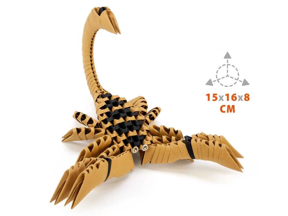 El origami 3D Escorpión de la marca Alexander es una actividad creativa divertida y relajante para niños y adultos. Las piezas tienen una forma patentada con línea de plegado marcada, por lo que el módulo básico se arma con tres movimientos simples y luego se encajan sin pegamento. El modelo terminado tiene un aspecto decorativo y se convertirá en un adorno original para la habitación.