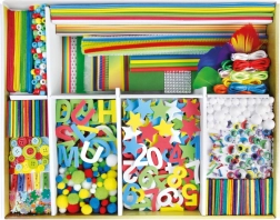 - aprox. 1300 piezas (acetato, papel translúcido, cartón ondulado de colores, fieltro, forro polar, gemas autoadhesivas, piezas de goma EVA, pinzas de la ropa, palitos de madera, plumas, cinta de crepé, botones, etc.)