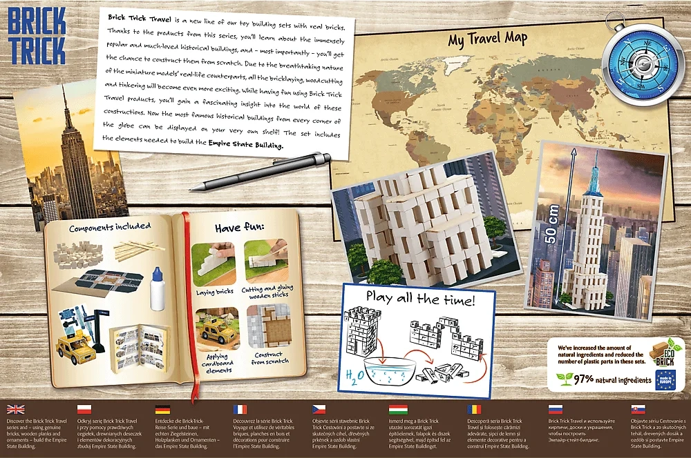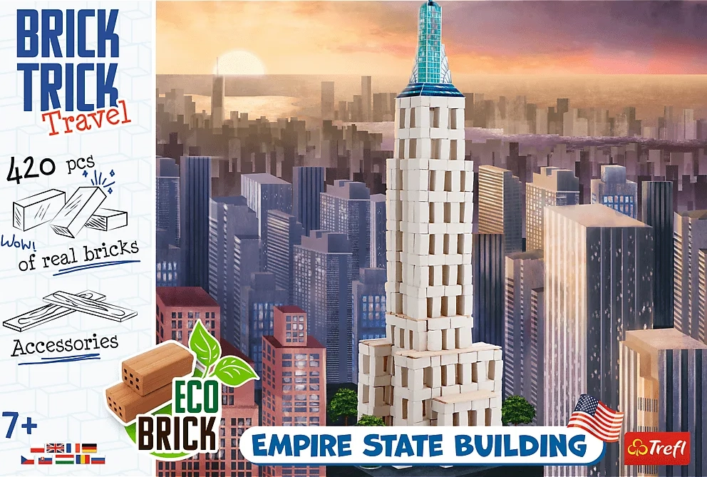 Descubre el mundo de la construcción con la línea BRICK TRICK Travel y crea tu propio modelo de una de las edificaciones más famosas del mundo: EMPIRE STATE BUILDING. Ladrillo a ladrillo, cortando y pegando tablillas, avanzarás paso a paso hasta lograr una estructura detallada y estable. Al final, la rematarás con las decoraciones incluidas para un aspecto auténtico.