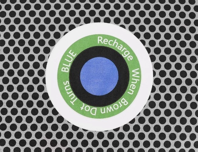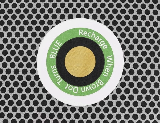 En el centro hay un indicador de color que muestra claramente el estado de saturación. El color naranja indica que el deshumidificador está seco y listo para usar; cuando cambia a azul, basta con “recargarlo” secándolo (por ejemplo, en el microondas). Así la humedad se evapora y el producto vuelve a estar listo para su uso repetido, con una vida útil de hasta 3 años.