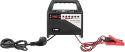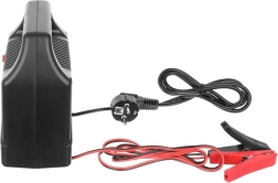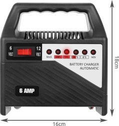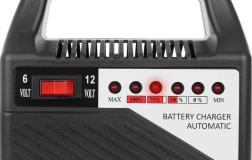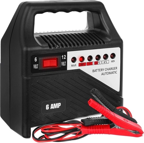 El asa práctica, las dimensiones compactas y el bajo peso facilitan el almacenamiento y el transporte. Con el selector eliges el voltaje correcto (6 V / 12 V) y las pinzas robustas garantizan un contacto seguro con los bornes de la batería.