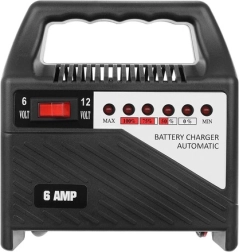 Cargador automático compacto para baterías de 6 V y 12 V con corriente de carga de hasta 6 A. Ideal para baterías de coche, de moto y acumuladores de plomo de 20–65 Ah. Ofrece selector de voltaje, indicadores LED del nivel de carga y bajo peso para facilitar el transporte.
