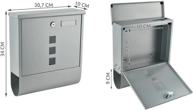 Especificaciones: Material: acero galvanizado inoxidable; Formato: A4; Dimensiones: 10 x 30,7 x 34 cm; Peso del buzón: 1,95 kg.