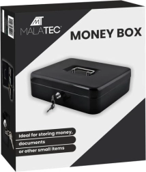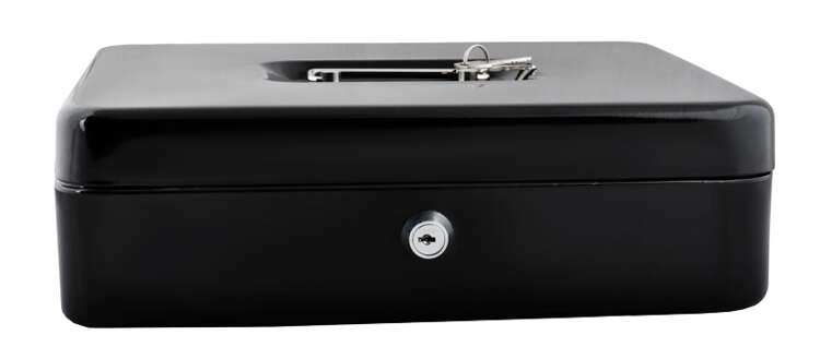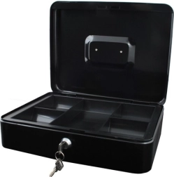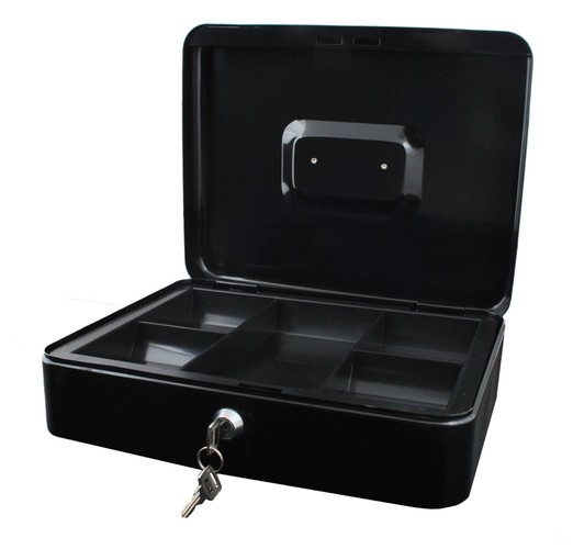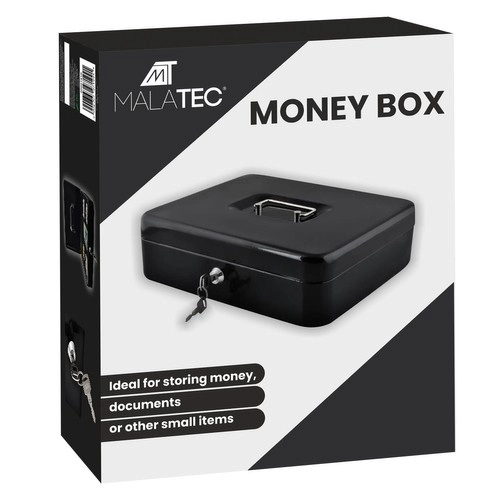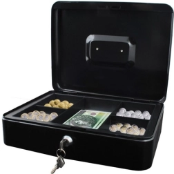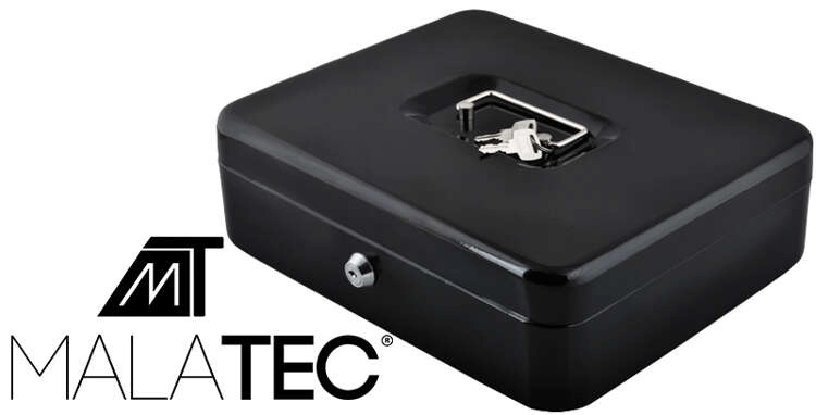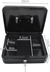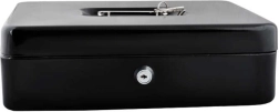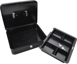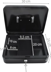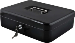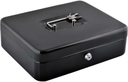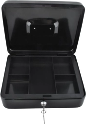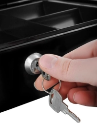 Esta gran caja registradora metálica en elegante color negro combina seguridad, orden y resistencia. La carcasa de acero pintado y las bisagras internas robustas protegen el contenido contra daños y accesos no autorizados, mientras que la cerradura con llave (2 llaves incluidas) asegura un cierre fiable.