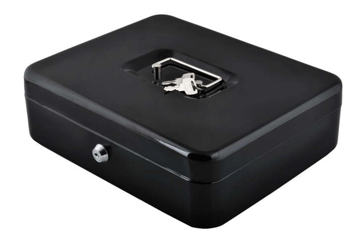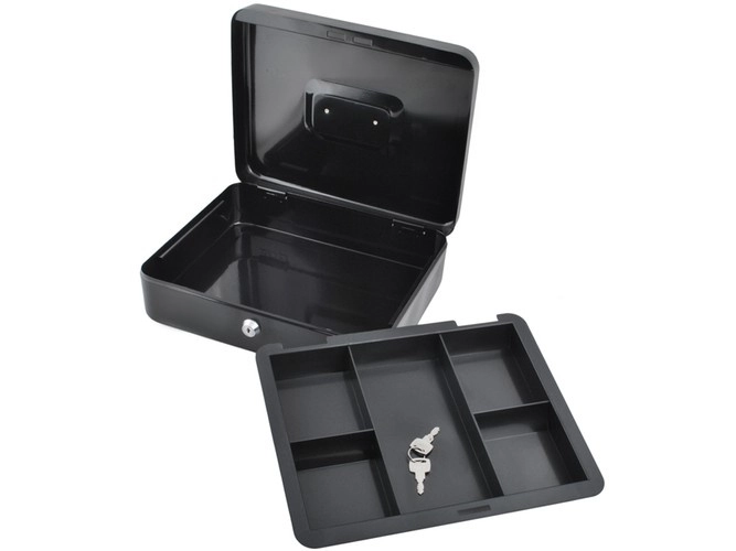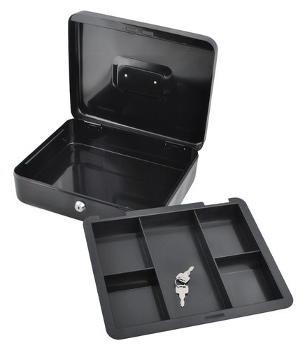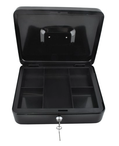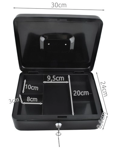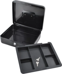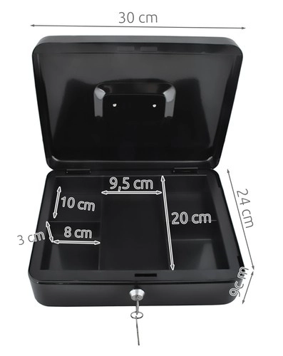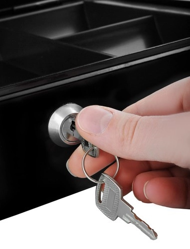 La práctica caja registradora de gran formato protege de forma fiable el efectivo, los documentos y pequeños objetos de valor. Gracias a su cerradura con llave, robusta construcción de acero, organizador interior con compartimentos y asa abatible, es ideal para el hogar, la oficina y eventos de venta.