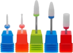Juego profesional de cinco fresas cerámicas para manicura y pedicura que ofrece eliminación rápida y delicada de gel, esmalte semipermanente y piel endurecida sin molestos picos de calor. Las cabezas cerámicas son ligeras, resistentes a las grietas y garantizan un trabajo fluido sin vibraciones. El diámetro estándar del vástago de 2,35 mm encaja en la mayoría de las limas eléctricas con cabeza “twist and lock”. Cada pieza viene en un estuche protector individual.