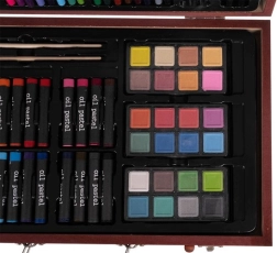 El completo set incluye ceras, pasteles al óleo, lápices de colores, pinturas acuarelables y accesorios imprescindibles, todo en compartimentos inteligentes para un acceso rápido.