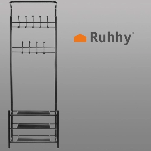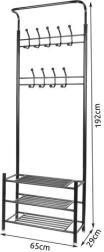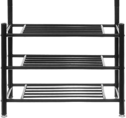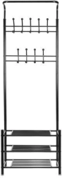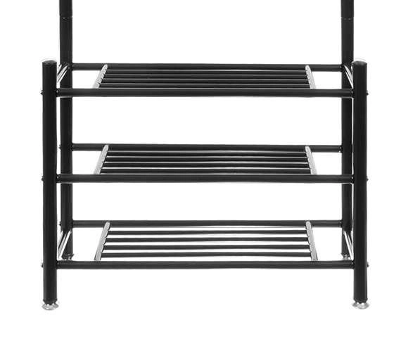 Este práctico perchero combina una barra superior con ganchos y tres estantes inferiores para zapatos, bolsos o cajas. Gracias a su diseño esbelto, encaja perfectamente en el recibidor, el pasillo o el dormitorio, ofreciendo acceso rápido a las prendas de uso frecuente.