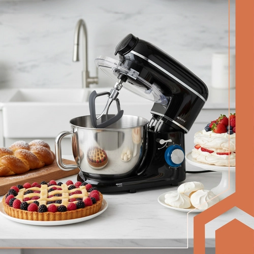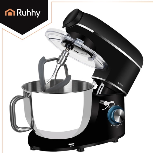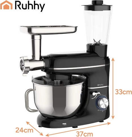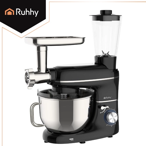 RUHHY 3 en 1 es un ayudante versátil para la cocina moderna. En una base estable obtienes un robot planetario para masas y cremas, una batidora de vaso para cócteles y sopas y una picadora de carne con tres discos para picar, rellenos y embutidos caseros. El potente motor de 1500 W con bobinado de cobre y la caja de engranajes metálica ofrecen un rendimiento fiable incluso con mezclas densas.