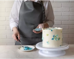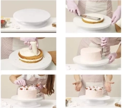 Equipado con una base desmontable para una manipulación sencilla, el mecanismo giratorio permite rotaciones suaves en ambos sentidos, lo que facilita la aplicación de glaseados y otras decoraciones. Las tres espátulas decorativas incluidas cuentan con diferentes patrones que permiten crear superficies únicas y creativas en tus tartas.