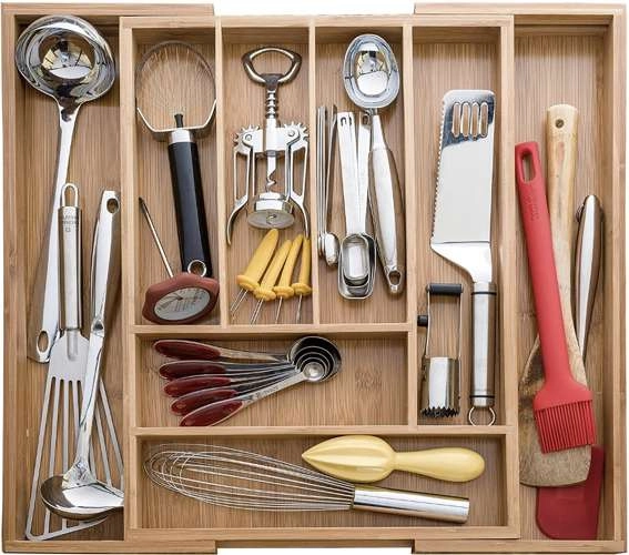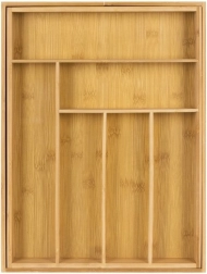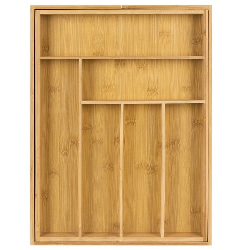 Pon orden en tus cubiertos, cuchillos y utensilios de cocina con el atemporal organizador de bambú RUHHY. Gracias a sus paneles laterales extensibles, obtendrás una distribución variable de 6 a 8 compartimentos, que se adapta fácilmente al contenido y al ancho del cajón. El material natural destaca por su resistencia, secado rápido y estética que encaja en cualquier cocina moderna.