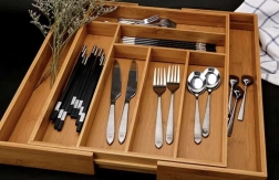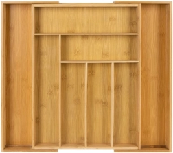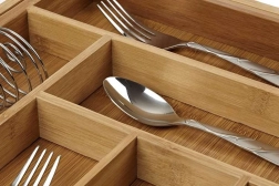 El organizador está diseñado para mantener las cosas bien organizadas en su sitio y facilitar el uso diario. El acabado liso en bambú reduce la adherencia de la suciedad y permite un mantenimiento sencillo bajo el grifo. La altura práctica y la división de los compartimentos garantizan un almacenamiento cómodo de cucharas, tenedores, cuchillos y pequeños accesorios.