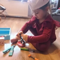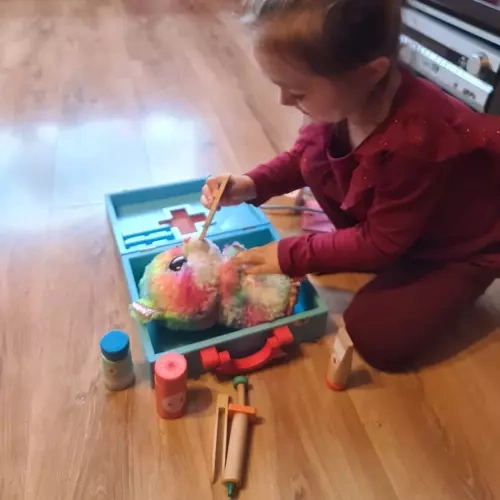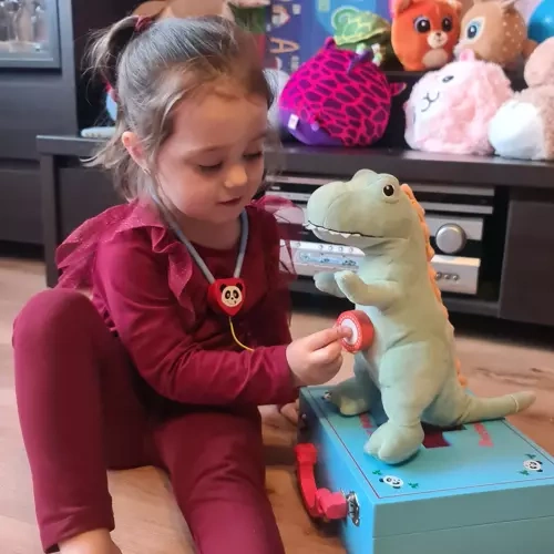 Desde estetoscopio y termómetro hasta tijeras, pinzas y “medicamentos”. Los niños tienen a mano todo lo necesario para examinar al paciente y cuidar los dientes.