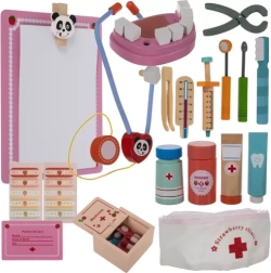 Este completo set médico y dental en un sólido maletín de madera ofrece a los niños accesorios realistas para practicar exámenes y el cuidado de los dientes. Gracias a su organización práctica y a la amplia variedad de herramientas, los niños aprenden de forma natural a reconocer formas, colores y procedimientos sanitarios mediante el juego.