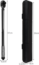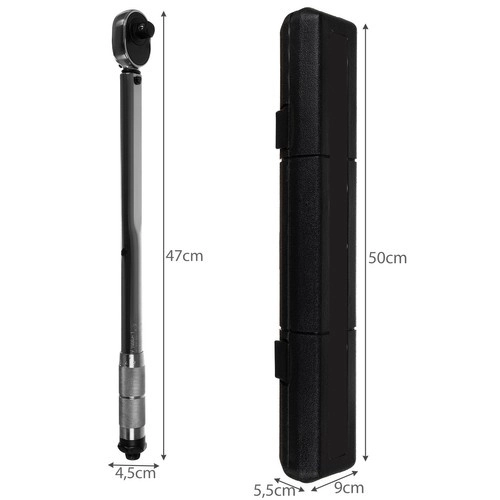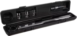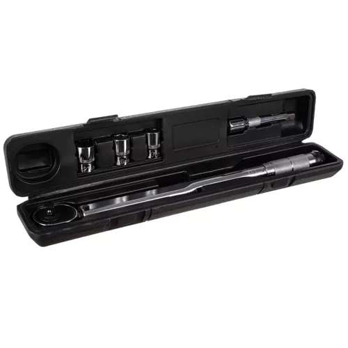 Robusta llave dinamométrica 1/2" con carraca y juego de vasos 17/19/21 mm y alargador para un apriete y aflojado precisos de uniones roscadas. Ofrece un rango de par de 28–210 Nm, funcionamiento bidireccional derecha/izquierda, bloqueo LOCK/UNLOCK y un práctico estuche protector para un almacenamiento seguro. Ideal para tornillos hexagonales y cuadrados, ganchos y tuercas de motocicleta.