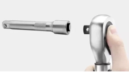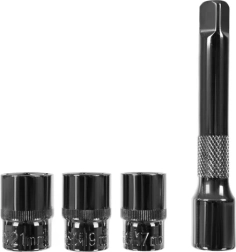 En el paquete encontrarás todo lo necesario: 3 vasos 17/19/21 mm y un alargador para mejor acceso. La fabricación en acero de alta calidad resiste deformaciones y roturas, y los elementos de silicona aumentan la comodidad de trabajo. También se incluye un estuche resistente que protege la herramienta durante el almacenamiento y el transporte.