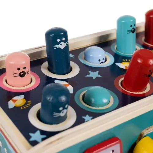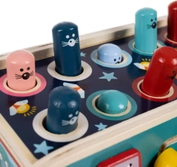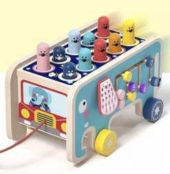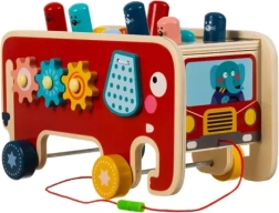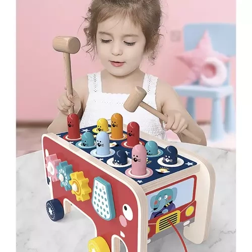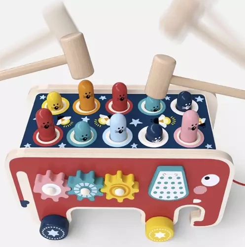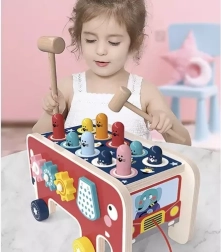 Este juguete fomenta el desarrollo de la motricidad fina y la concentración gracias a elementos interactivos como los martillitos y los engranajes.