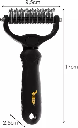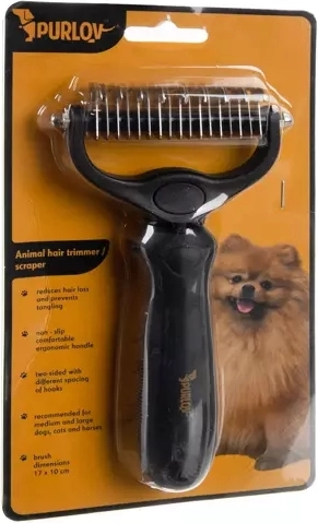 ¿Busca una solución eficaz contra los pelos en la ropa y los muebles? El trimmer y rastrillo doble PURLOV está diseñado para un cepillado rápido y suave de perros y gatos. Las dos separaciones de dientes (17 y 9) pueden con cualquier tipo de pelaje, desde subcapa densa hasta pelo más fino. Los bordes internos están afilados para cortar suavemente los nudos, mientras que las puntas redondeadas protegen la piel de su mascota.