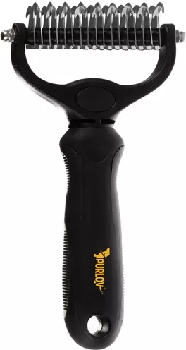 El trimmer y rastrillo de pelo universal de doble cara PURLOV para perros y gatos combina un lado con 17 dientes más finos y otro con 9 dientes más anchos para la densa subcapa y el pelo fino. Reduce eficazmente la muda, desenreda fácilmente nudos y subcapa y gracias a su mango ergonómico antideslizante se usa con comodidad. Las puntas redondeadas de los dientes son suaves con la piel.