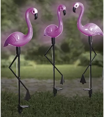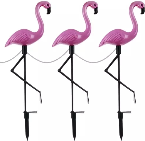 En el paquete recibirás tres luces con forma de flamenco, conectadas a un panel solar y equipadas con diodos LED para una iluminación suave.