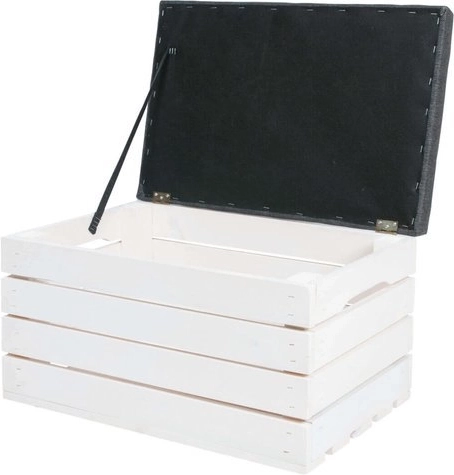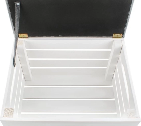 La tapa abatible con bisagras y correa de sujeción da acceso a un gran espacio para mantas, zapatos o juguetes y mantiene el hogar libre de desorden.