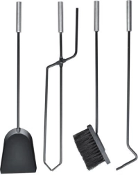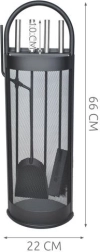 El juego incluye todo lo necesario para un uso seguro y limpio de la chimenea: gancho/poker, tenazas, pala, cepillo y soporte con cubierta protectora y asa para un transporte sencillo. La robusta estructura de acero y la fabricación sólida garantizan una larga durabilidad, mientras que la base del soporte recoge polvo y ceniza para mantener su hogar limpio.