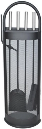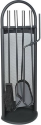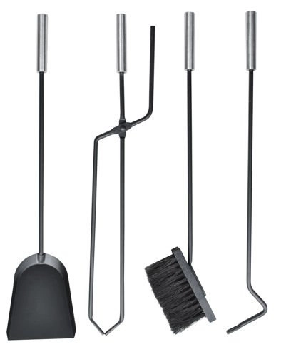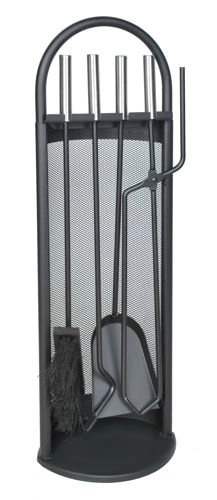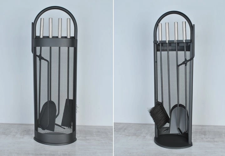 Todo a mano: tenazas, pala, cepillo, gancho/poker y un soporte estable para un almacenamiento ordenado y acceso rápido durante el uso de la chimenea.