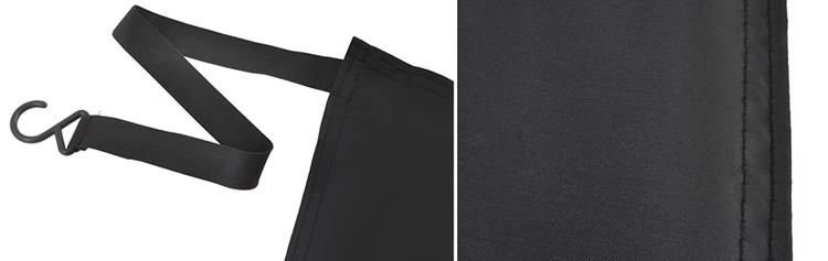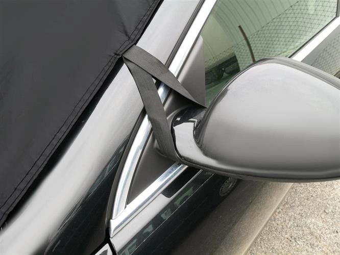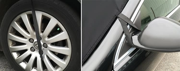 Las bandas elásticas con ganchos se sujetan a los retrovisores y a las ruedas, y los bordes se aseguran con las puertas. La cubierta se adhiere al cristal y resiste el viento.