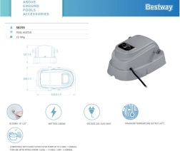 La instalación es sencilla: solo tienes que conectar el calentador al sistema de filtración de la piscina. El dispositivo está diseñado para piscinas elevadas con un volumen de 1 520–17 035 l y caudal de bomba de hasta 3 785 l/h. La temperatura máxima es de 40 °C (alcanzable según la temperatura de entrada del agua y del entorno). La construcción robusta y el cable de alimentación largo de 3,5 m facilitan la colocación y el uso.