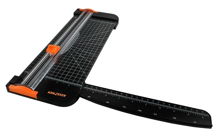 La escala integrada en centímetros y pulgadas, la cuadrícula y la regla guía transparente permiten ajustar el papel con precisión milimétrica y cortar recto o en ángulo.