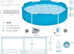 El marco de la piscina está fabricado con material metálico resistente, que garantiza la estabilidad y una larga vida útil de toda la estructura. Las paredes combinan poliéster resistente y PVC, lo que aporta a la piscina la capacidad de resistir daños y un uso intensivo.