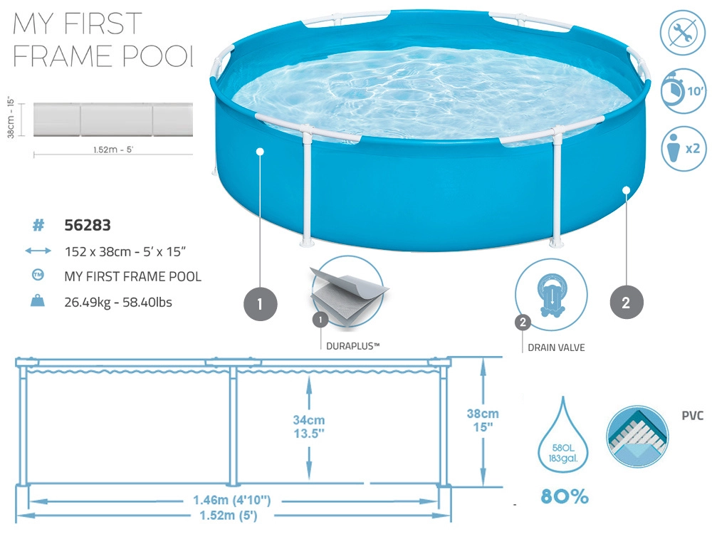 Desplegar la piscina es muy fácil y rápido, lo que significa que puede estar lista para su uso en muy poco tiempo para disfrutar de la diversión acuática.