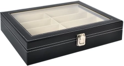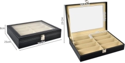 Este práctico y elegante estuche para gafas de la marca SOULIMA combina diseño sofisticado con organización funcional. La ecopiel negra con costuras blancas ofrece un aspecto representativo, mientras que el inserto interior claro muestra claramente cada par. La tapa de vidrio permite una vista rápida y una exposición decorativa.